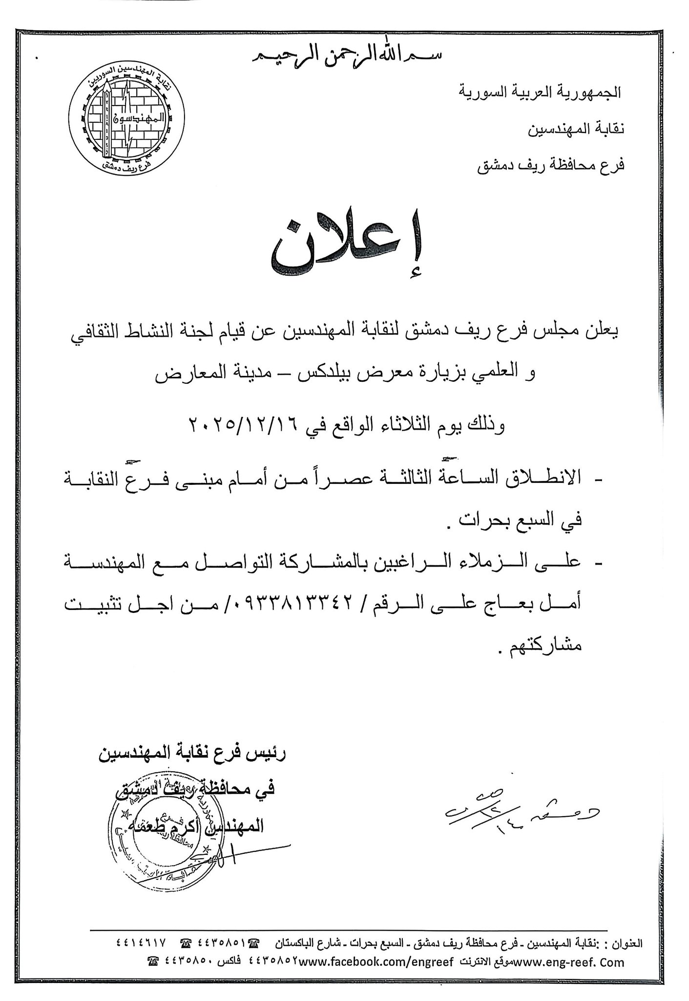 يعلن فرع ريف دمشق لنقابة المهندسين عن زيارة لمعرض بيلدكس