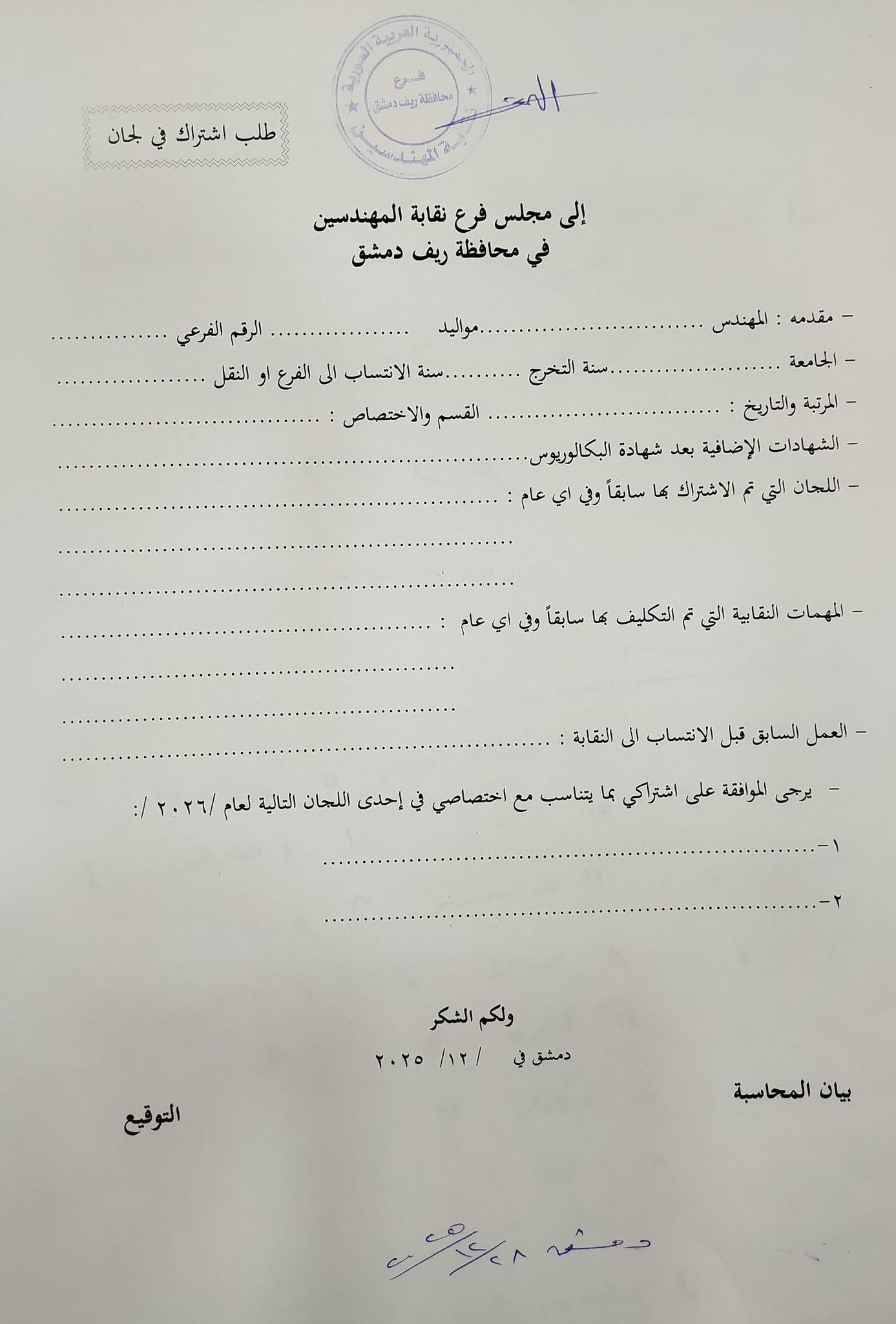 يعلن مجلس فرع ريف دمشق عن فتح باب التقدم للمشاركة باللجان الهندسية المهنية والعلمية والثقافية والاجتماعية